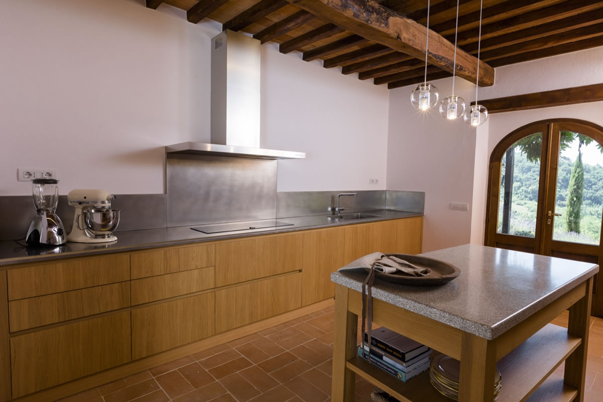 FacebookIn a typically Tuscan setting with wooden beams, terracotta floors and stone walls, our customers opted for a contemporary kitchen with honey-painted wooden doors and Vintage steel countertops.