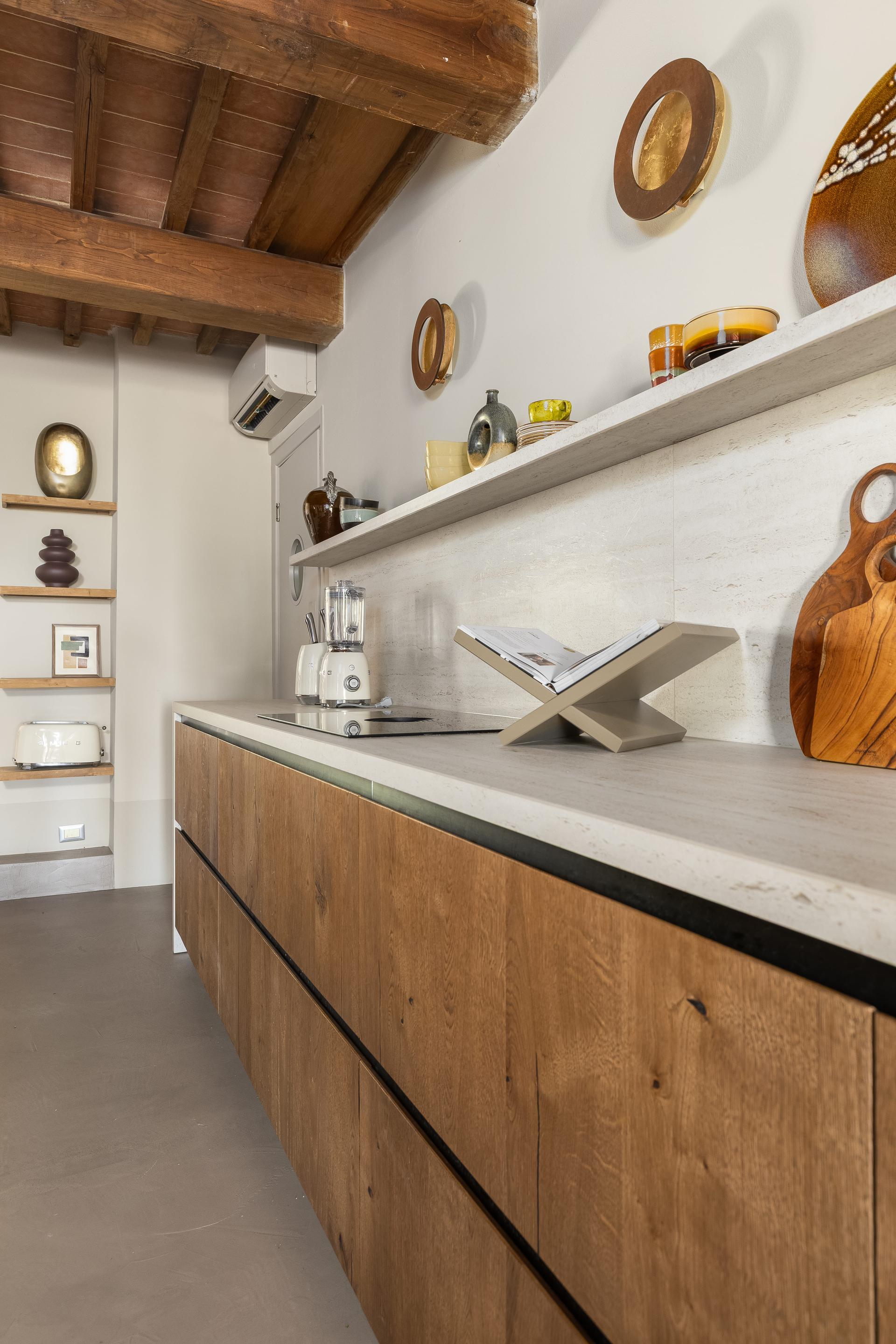 Nel cuore del Chianti sorge un magnifico casolare, i cui interni, sono stati trasformato creando ambienti avvolgenti e caldi. Lo stile coniuga l'eleganza scandinava con il modernariato, pur mantenendo nuance terrose tipiche della Toscana classica. Per questo ambiente è stato scelto il modello ESSENCE ROVERE in legno rusticone, che celebra la materia viva del legno. Una cucina che presenta un'isola centrale attrezzata e mobili bassi, sormontati da lunghe mensole a vista al posto dei pensili, che alleggeriscono l'ambiente e permettendo alla luce di riflettersi.